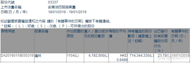 智通财经APP获悉,联交所股权变动资料显示,罗林于1月16日增持安东油田服务(03337)419万股,每股作价约0.85港元,总值约365.15万港元,最新持股数目约7.14亿股,最新持股比例增至23.78%。