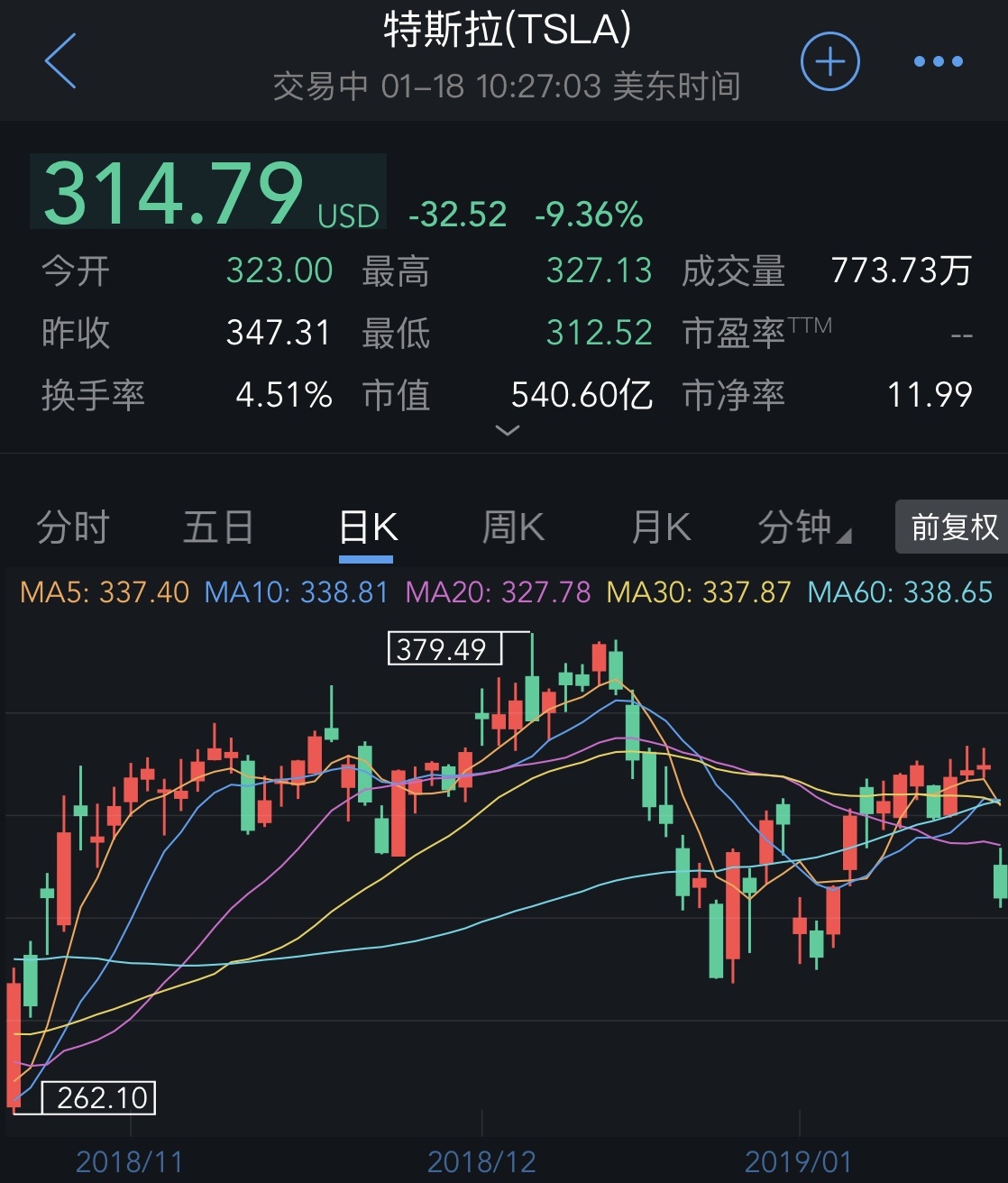 智通财经APP获悉,开盘后特斯拉(TSLA.US)跌势不止,截止发稿,特斯拉跌9.36%,报314.79美元。