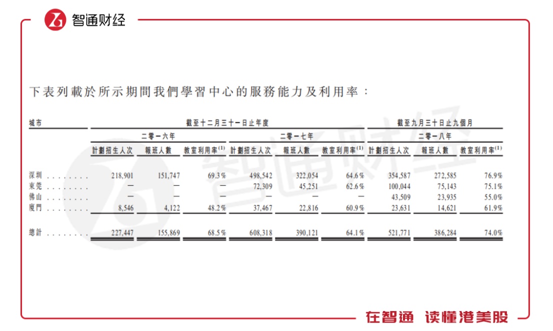 截至2018年9月30日,公司学习中心数量已经扩展至深圳、东莞、佛山和厦门四个城市,在这些城市拥有56间学习中心,学习中心的就读学生总数达到22.15万名。