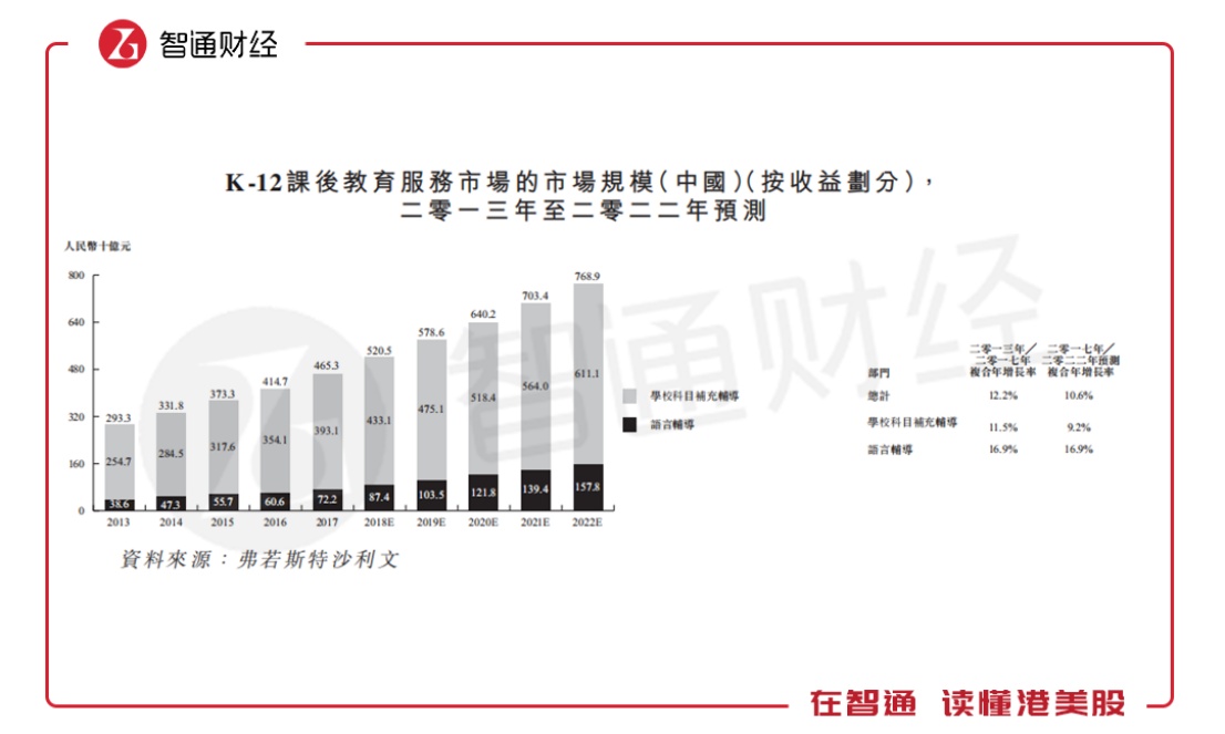 根据弗若斯特沙利文报告,预期到2022年中国课后教育服务市场规模将达到7689亿元,自2017年至2022年之复合年增长率为10.6%。中国K12课后教育服务市场所得总收益于2018年至2022年的复合年增长率预期将为10.6%。