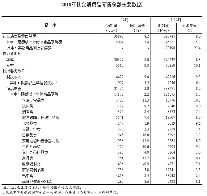 智通财经APP获悉,1月21日,国家统计局公布,2018年1-12月,社会消费品零售总额380987亿元,比上年增长9.0%(扣除价格因素实际增长6.9%,以下除特殊说明外均为名义增长),增速比1-11月略低0.1个百分点。其中,限额以上单位消费品零售额145311亿元,增长5.7%。