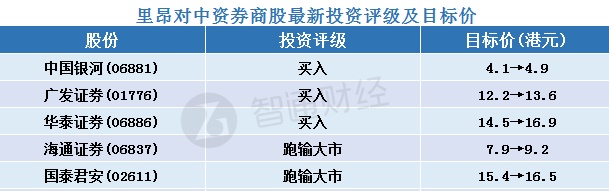 三、里昂对中资券商股最新投资评级及目标价汇总