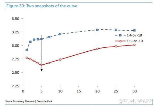 德意志银行信贷策略师Aleksandar Kocic 解释道: “美国资本市场和美联储是相互依赖的,会对对方的一举一动作出反应。”在上一年第四季度时,Kocic就发现了美国资本市场和美联储之间的关系好像变得越来越微妙。Kocic给出了下图,显示出了2018年11月和2019年1月份的利率掉期合同(SWAP)的走势。