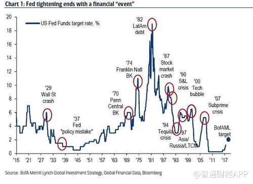 “尽管有许多分析师认为美联储加息最终会催生下一次经济衰退, 而每一次紧缩后都以一个金融“事件”结束(如下图所示)。但事实是,这些分析师们遗漏了一点,美国过去三次经济衰退都是在美联储加息结束后开始第一次降息时发生的。”