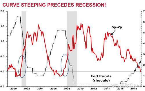 兴业银行也给出了下面的图表,显示出利率曲线扁平并不是衰退的催化剂,曲线急剧变化时,才标志着衰退的开始。