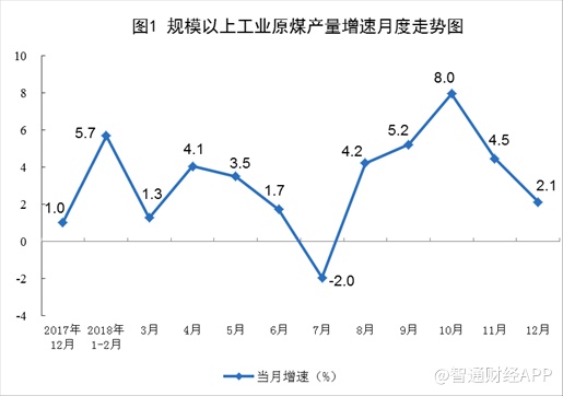 智通财经APP获悉,国家统计局今日(1月21日)公布了2018年12月份能源生产情况,数据显示,12月份原煤产量3.2亿吨,同比增长2.1%,增速比上月回落2.4个百分点,创下逾三年来最高,因冬季需求旺盛推动主要矿商增加生产,且一些新矿也开始上马。