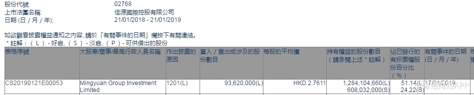 智通财经APP获悉,根据联交所资料显示,Mingyuan Group Investment Ltd于1月17日减持佳源国际控股(02768)9362万股,每股作价2.7611港元,总值2.58亿港元,最新持股数减至12.84亿股,最新持股比例减至51.14%。