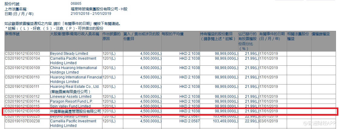 智通财经APP获悉,根据联交所资料显示,中国华融(02799)于2019年1月17日减持福莱特玻璃(06865)450万股,每股作价2.1港元,总值945万港元,最新持股数减至9,896万股,最新持股比例减至21.99%。