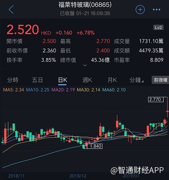 截至今日收盘,福莱特玻璃(06865)涨6.78%,报2.52港元。