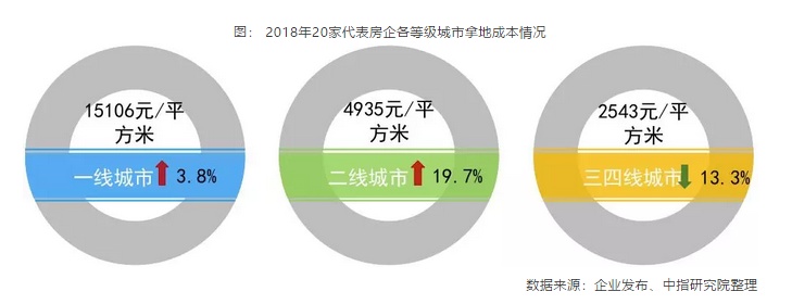 开发商热情逐渐减退,拿地楼面价同比小幅下降。2018年以来,房地产调控政策继续深化,重点城市市场整顿力度持续强化,对于土地提出更为苛刻的条件,比如配建规模增多、限价条款严格,从而限制了企业的拿地能力,拿地均价同比下降7.4%。具体来看,一线城市,20家代表房企拿地楼面价同比微涨3.8%;二线城市,20家代表房企拿地楼面价同比上涨19.7%;三四线城市,20家代表房企拿地楼面价同比下降13.3%。