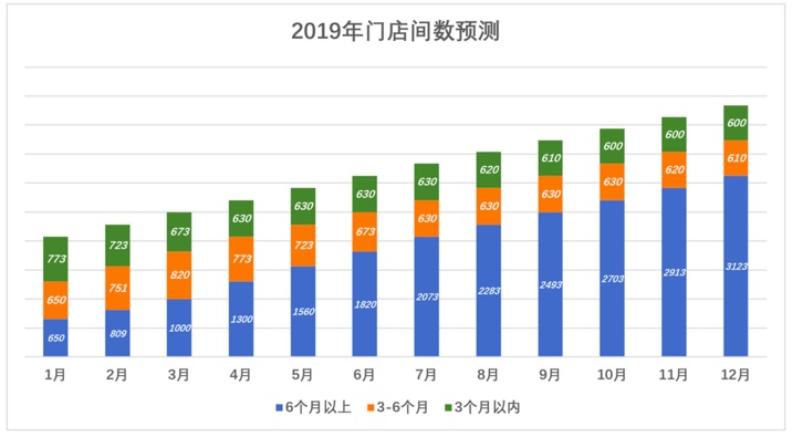 假设上半年每月新开210间,下半年每月新开200间,全年新开2460间,2019年末门店数4533间。