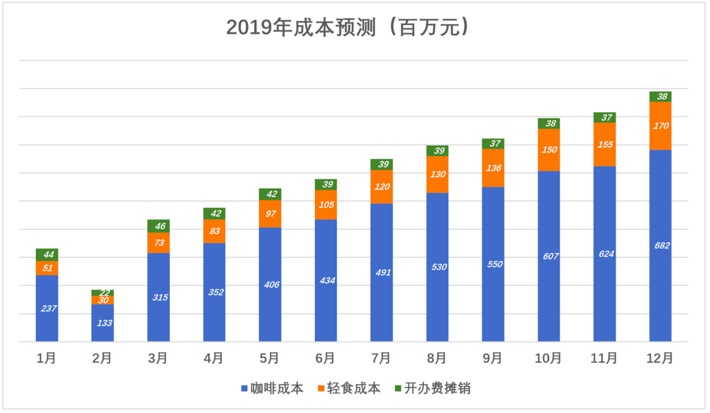 根据上文假设,2019年瑞幸将卖出4.1亿杯咖啡,按每杯15元计算收入61.9亿。补贴后15元,保持相对于竞争对手的优势。轻食销售额为咖啡的30%,全年收入18.6亿。咖啡、轻食合计80.5亿元。