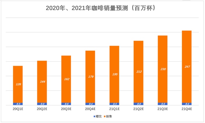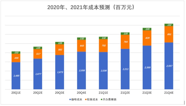 由于规模效益,假设2020年每杯成本降至11元,2021年降到10元。2020年、2021年总成本227亿元,毛利润65.5亿元。