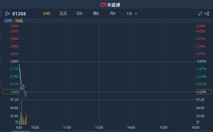 智通财经APP获悉,五矿资源(01208)昨日发盈警创下2002年以来最糟糕单日表现,今日延续弱势,继续跳水,截至9时43分,跌4.29%,报2.68港元,成交额1412万港元。