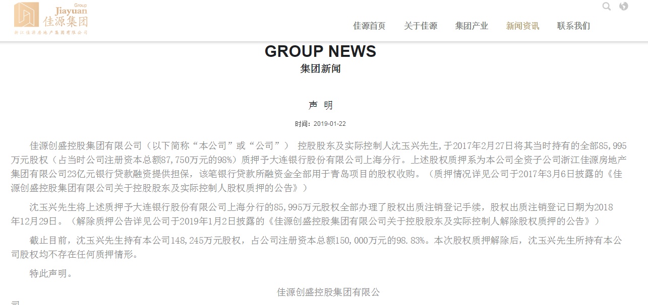 沈玉兴先生将上述质押予大连银行股份有限公司上海分行的85,995万元股权全部办理了股权出质注销登记手续,股权出质注销登记日期为2018年12月29日。(解除质押公告详见公司于2019年1月2日披露的《佳源创盛控股集团有限公司关于控股股东及实际控制人解除股权质押的公告》)