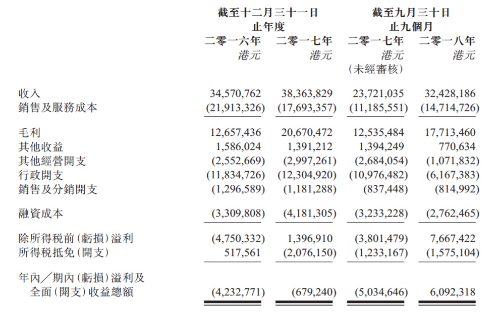 截至2016年及2017年12月31日止两个年度,以及截至2017年及2018年9月30日止9个月,我们的毛利分别约为1270万港元、2070万港元、1250万港元及1770万港元,毛利率分别约为36.6%、53,9%、52.8%及54.6%。