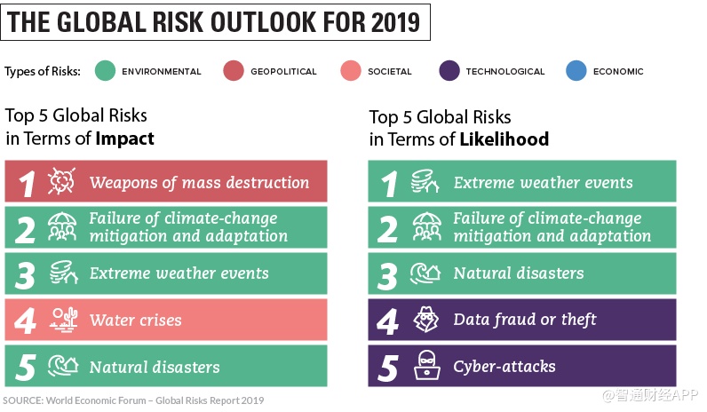 智通财经APP获悉,当地时间1月22日,2019年世界经济论坛年会在瑞士小镇达沃斯正式开幕。同时,该组织发布了最新一期《全球风险报告》,总结目前世界上最迫切需要关注的问题。