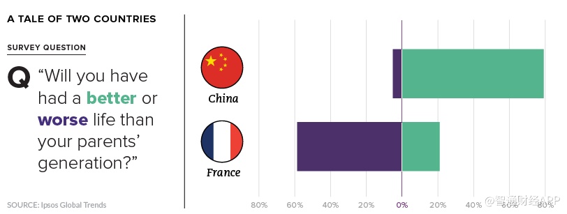在中国,受访者普遍认为情况正在好转,而近60%的法国受访者对他们这一代人的未来持悲观态度。类似的悲观情绪也反映在许多其他发达国家公民的意见中。