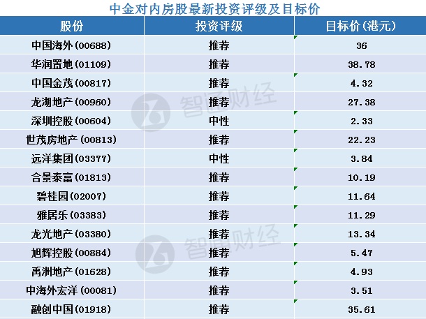 一、中金对内房股最新投资评级及目标价汇总
