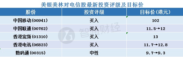 三、美银美林对电信股最新投资评级及目标价汇总