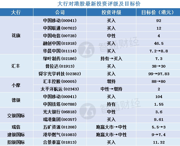 五、大行对港股最新投资评级及目标价汇总