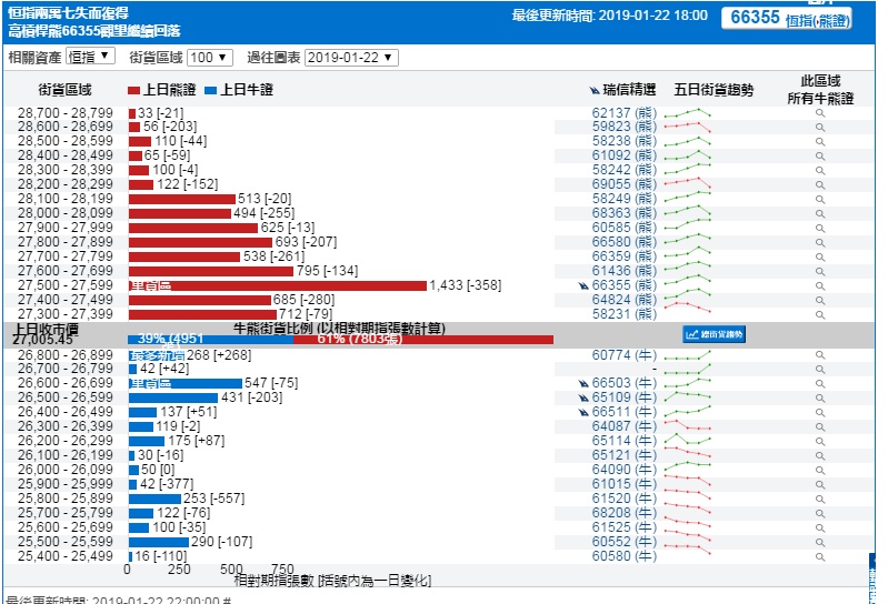 智通财经APP获悉,截至1月22日,恒指最新的牛熊街货比例39:61。从瑞信恒指牛熊证街货分布图中得到的数据显示,熊证街货重货区在27500-27599区间,该区间最新熊证数量为1433张,减少358张,无新增区间。牛证街货重货区在26600-26699区间,该区间最新牛证数量为547张,比上一交易日减少75张,最多新增区间在26800-26899区间,新增268张。