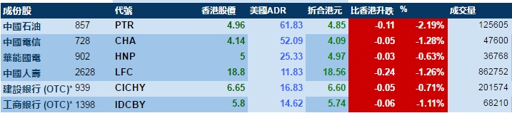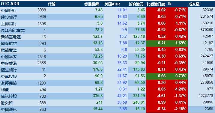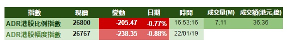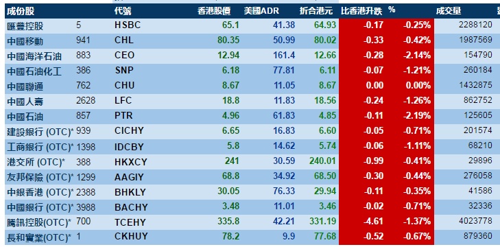 智通财经APP获悉,美股周二向下,港股ADR指数随之走低,按比例计算,收报26800点,跌205.47点。大型蓝筹全线下跌,汇丰控股收报65.1元,较港收市跌0.17元;腾讯控股收报331.19元,较港收市跌4.16元。