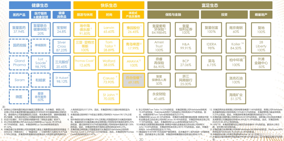 第二部分,快乐生态。复星旅游文化集团已于2018年12月在香港上市,其中核心资产包括了地中海俱乐部和三亚﹒亚特兰蒂斯;在时尚领域,复星时尚集团旗下已拥有Lavin、Wolford、St. John等品牌,每个品牌都非常独特,有自己的个性,Lanvin是巴黎式的优雅和浪漫,Wolford的技术是它的一个标签,让客户有第二层肌肤的感觉,St. John曾经是美国第一夫人的御用品牌,具有免熨烫的特点,Caruso是意大利最大的奢侈品男装生产厂商之一,有很强大的生产技术和独立完整的生产线;此外,豫园已于2018年7月完成资产重组,成为复星快乐时尚的重要旗舰平台。