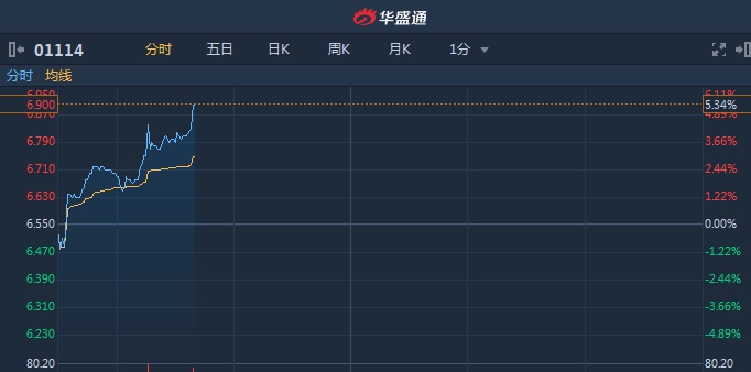 智通财经APP获悉,汽车股整体走高,华晨中国(01114)获花旗上调目标价至8.8港元,评级“买入”,股价造好。截至10时40分,涨5.34%,报价6.9港元,成交额4209万。