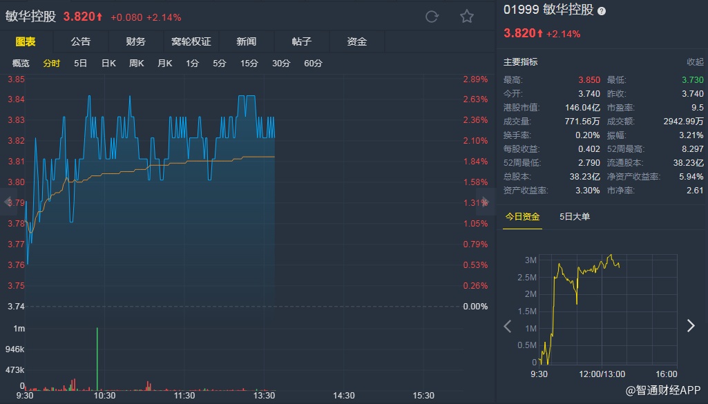 智通财经APP获悉,大和资本发表研究报告称,敏华控股(01999)股价于过去六个月累跌35%,估值已接近多年低位,大部分负面因素已反映,加上预计其利润率将改善,将公司目标价由3.3港元升至4港元,评级由“逊于大市”调高至“持有”,2019至2020财年每股盈测升12至29%。