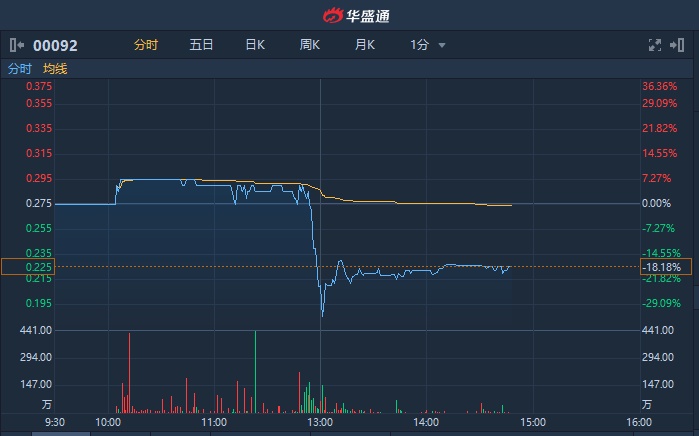 智通财经APP获悉,冠军科技(00092)午后快速跳水,一度跌超30%,盘中见历史新低0.185港元,截至14时45分,跌18.18%,报0.225港元,成交额1304万港元。
