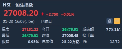 智通财经APP获悉,恒指坚守两万七关口,早盘低开0.46%,报26879.91点。截至收盘,恒生指数涨2.75点或0.01%,报27008.2点,全日成交额达778.19亿。国企指数涨0.17%,报10631.03点,红筹指数涨0.24%,报4301.14点。