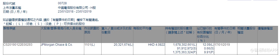 智通财经APP获悉,根据联交所资料显示,摩根大通于1月17日增持中国电信(00728)2032万股,每股作价4.08港元,总值8290.56万港元,最新持股数增至16.78亿股,最新持股比例增至12.09%。