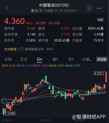 截至今日收盘,中国电信(00728)涨5.31%,报4.36港元。