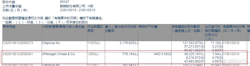 智通财经APP获悉,根据联交所资料显示,摩根大通于1月17日减持鞍钢股份(00347)77万股,每股作价5.5932港元,总值435.24万港元,最新持股数减至8622万股,最新持股比例减至7.94%。