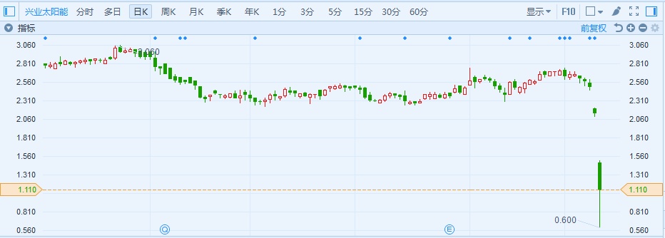 1月23日,据智通财经APP观察,兴业太阳能在竞价时段低开31.63%,报价1.47港元,已经垫底港股涨幅榜。没想到,开盘后短短5分钟内,兴业太阳能伴随着大量的卖盘,股价进一步跳水,跌幅扩大至72.09%,低见0.6港元。截至收盘,兴业太阳能虽然跌幅有所收窄,但跌幅仍有48.37%,报价1.11港元,成交额为6.23亿港元。