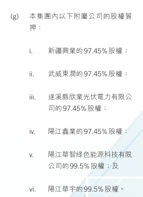 另外,除了上述所讲的有抵押银行贷款之外,兴业太阳能已经将大部分的附属公司的股权已经进行质押,而且质押率都超过90%。这代表着,兴业太阳能已经没有多余的融资能力。