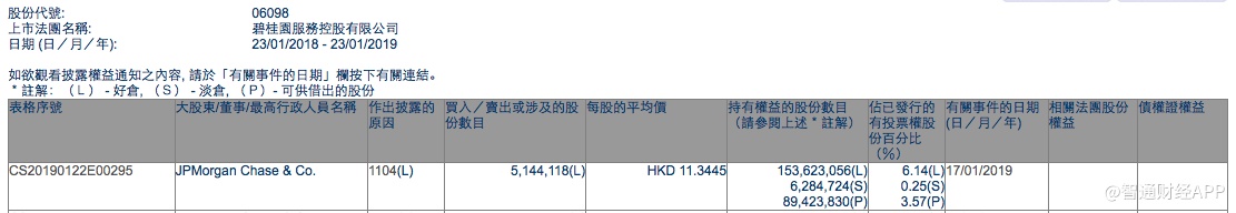 智通财经APP获悉,根据联交所资料显示,摩根大通于1月17日增持碧桂园服务(06098)514万股,每股作价11.34港元,总值5828.76万港元,最新持股数增至1.53亿股,最新持股比例增至6.14%。