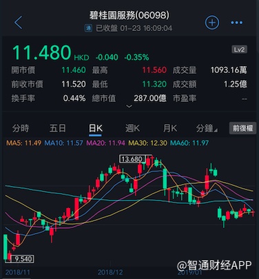 截至今日收盘,碧桂园服务(06098)跌0.35%,报11.48港元。