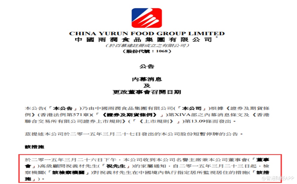 时间拨回2015年3月27日,当天雨润食品发布公告称,公司的股份将于2015年3月27日上午9时正起于香港联合交易所有限公司暂停买卖,待发出有关公司内幕消息的公告。