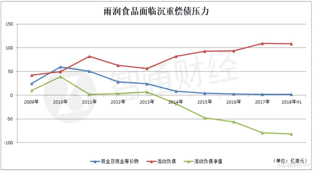 智通财经查阅雨润财务报告发现,2018年上半年,公司的负债额合计高达111.8亿元,负债率上升至60.35%。公司要想凭借自身财务状况还债在短期内几无可能,财报显示,公司账上现金及现金等价物仅为1.47亿元,流动比率仅为0.25倍,速动比率仅为0.18倍。此外,公司经营活动已经无法为公司正常“输血”,公司自2012年年报以来连续6年经营活动现金为净流出,2018年上半年为净流出0.76亿元。