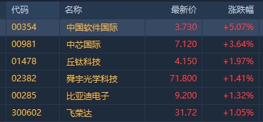 智通财经APP获悉,华为概念股早盘普涨,截至发稿,中国软件国际(00354)涨5.07%,中芯国际(00981)涨3.64%,丘钛科技(01478)、舜宇(02382)、比亚迪电子(00285)均涨近2%。