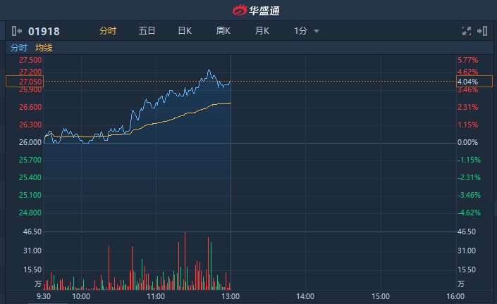 智通财经APP获悉,融创中国(01918)今日升势显著,截至12时整,涨4.04%,报27.05港元,成交额3.23亿港元。