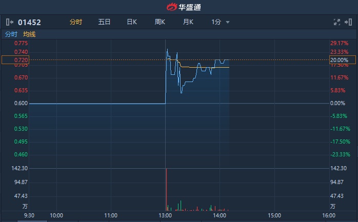 智通财经APP获悉,迪诺斯环保(01452)午后直线拉升,截至14时8分,涨20%,报0.72港元,成交额248.5万港元。