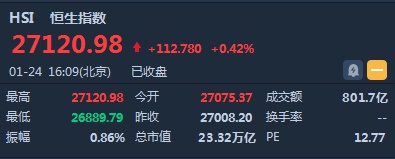 智通财经APP获悉,恒指早盘高开0.25%,报27075.37点。截至收盘,恒生指数涨112.78点或0.42%,报27120.98点,全日成交额达796.91亿。国企指数涨0.56%,报10691点,红筹指数涨0.79%,报4335.24点。