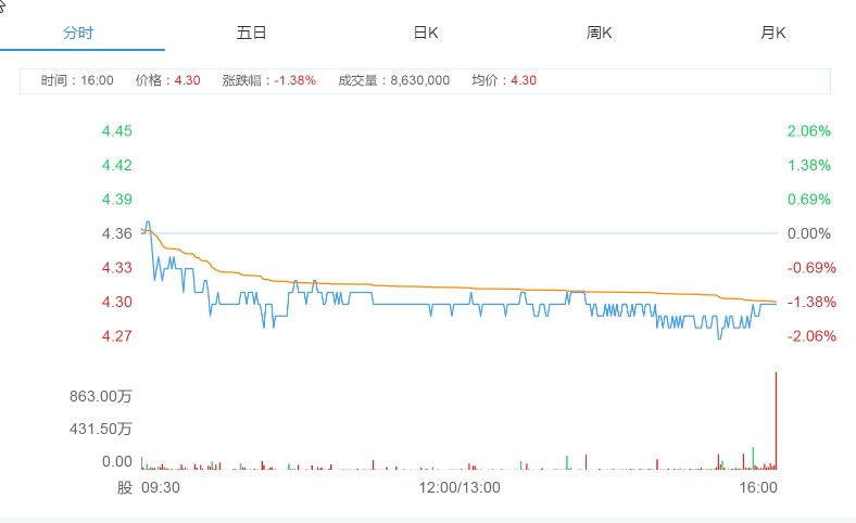 截至今日收盘,中国电信跌1.38%,报4.3港元。