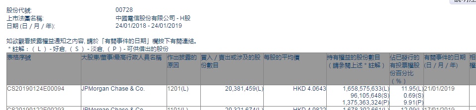 智通财经APP获悉,根据联交所资料显示,摩根大通于1月21日减持中国电信(00728)2038万股,每股作价4.0643港元,总值8283.63万港元,最新持股数减至16.58亿股,最新持股比例减至11.95%。