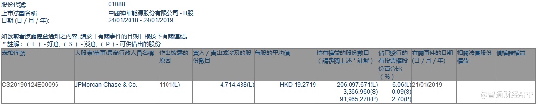 智通财经APP获悉,根据联交所资料显示,摩根大通于1月21日增持中国神华(01088)471万股,每股作价19.27港元,总值9076.17万港元,最新持股数增至2.06亿股,最新持股比例增至6.06%。