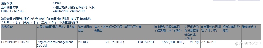 智通财经APP获悉,根据联交所资料显示,Ping An Asset Management Co., Ltd于1月22日增持工商银行(01398)2003万股,每股作价5.81港元,总值1亿1639万港元,最新持股数增至95.55亿股,最新持股比例增至11%。