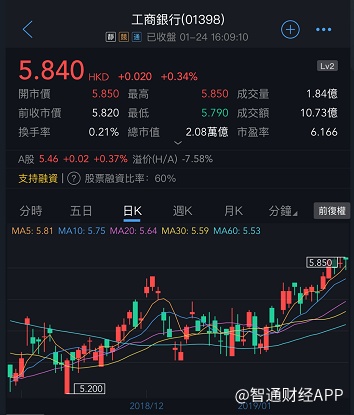 截至今日收盘,工商银行(01398)涨0.34%,报5.84港元。